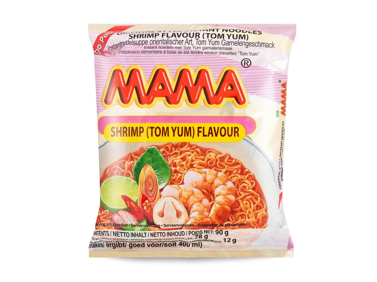 Thai stlye noodles with shrimp tom yum flavoured soup. Ready in 3 minutes.
